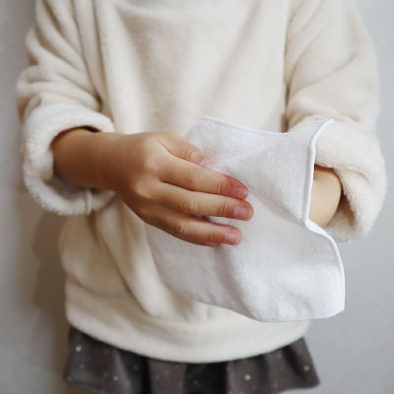 お子さまの小さなポケットに入れても膨らまないちょうどよい厚さにこだわった小さなハンカチです。たたみやすいように角は四角、お名前タグつき。3枚セットなので、日常使いにもぴったりです。