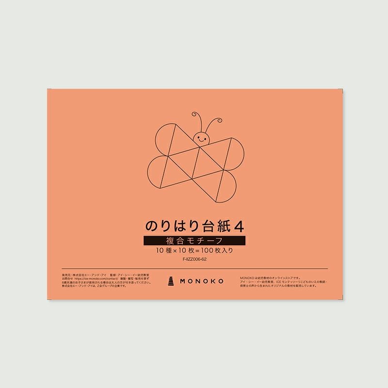 正方形の一辺が35mmを基準に「円」「三角」「四角」「二等辺三角」「半円」の5種のピースで構成されています。のりはり台紙4は一枚に6~11までの色紙を具体物のモチーフに貼ります。