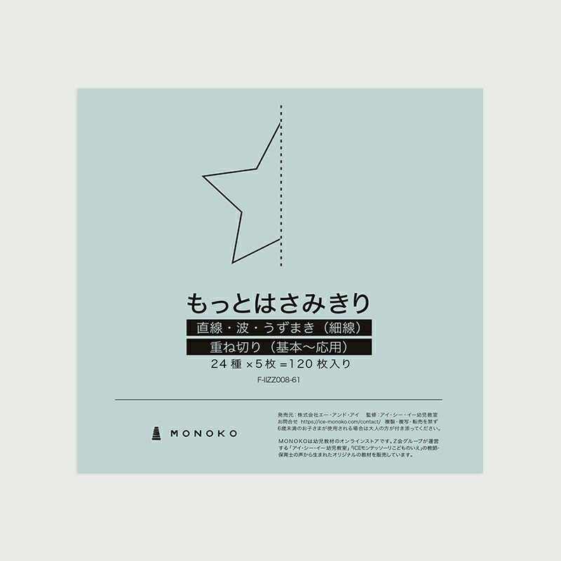 はさみに少し慣れてきたお子さまのための、はさみきりの専用紙です。「直線切り」の簡単なものから「曲線切り」や、複雑な絵柄の「重ね切り」をセットにしました。お子さまの手で持ちやすいサイズで、はさみで切るところは、中細の線で描かれています。2021年10月改定。