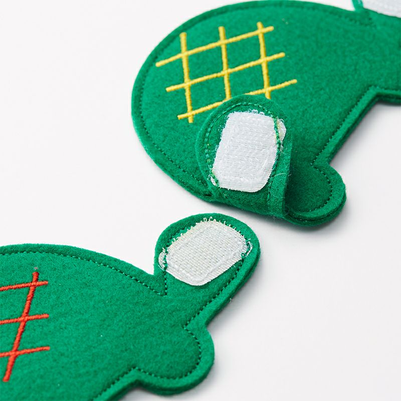 かめのモチーフを面ファスナーでつないで遊びます。甲羅の刺繍が赤と黄色の2色あるので、同じ色や違う色でつないだり、交互につないで遊ぶこともできます。保育の現場で教師が手作りしていた教材を、お子さまが思わず手に取りたくなるようかわいいデザインにして商品化しました。日本製。