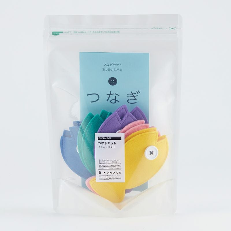さかなのモチーフをボタンでつないで遊びます。5色あるので、違う色を交互につないで遊べます。保育の現場で教師が手作りしていた教材を、お子さまが思わず手に取りたくなるようかわいいデザインにして商品化しました。片づけるところまでセットで活動できるよう、お気に入りの箱やカゴに入れるなど工夫してください。日本製。