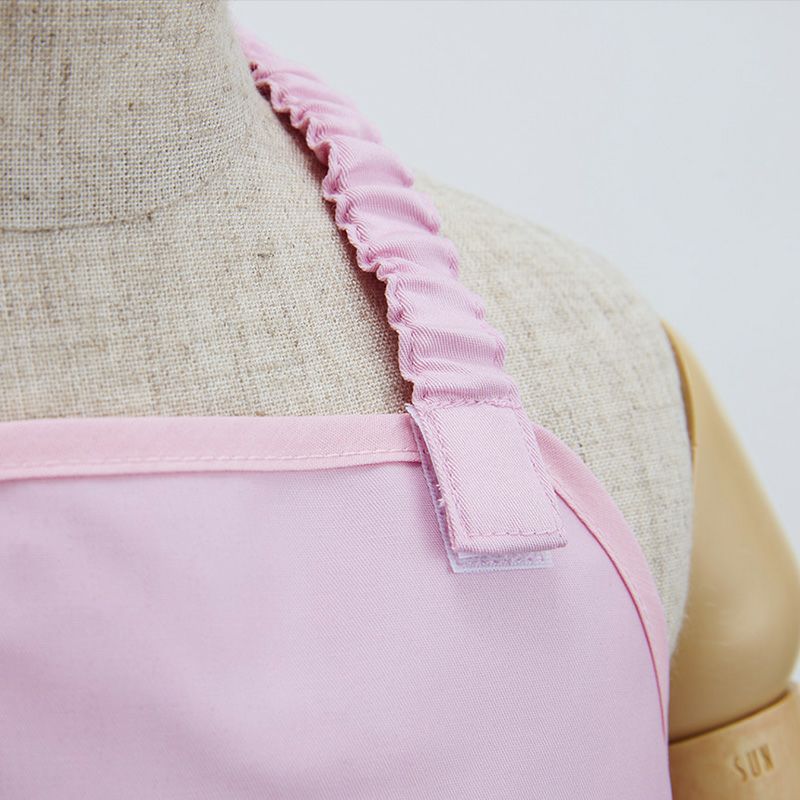 首ひもはゴムが入っています。腕が上手に後ろに回るようになったら、前にあるマジックテープを自分で留めることができます。腰ひもも同様に自分で留められます。自分でできる喜びを感じられるエプロンです。