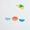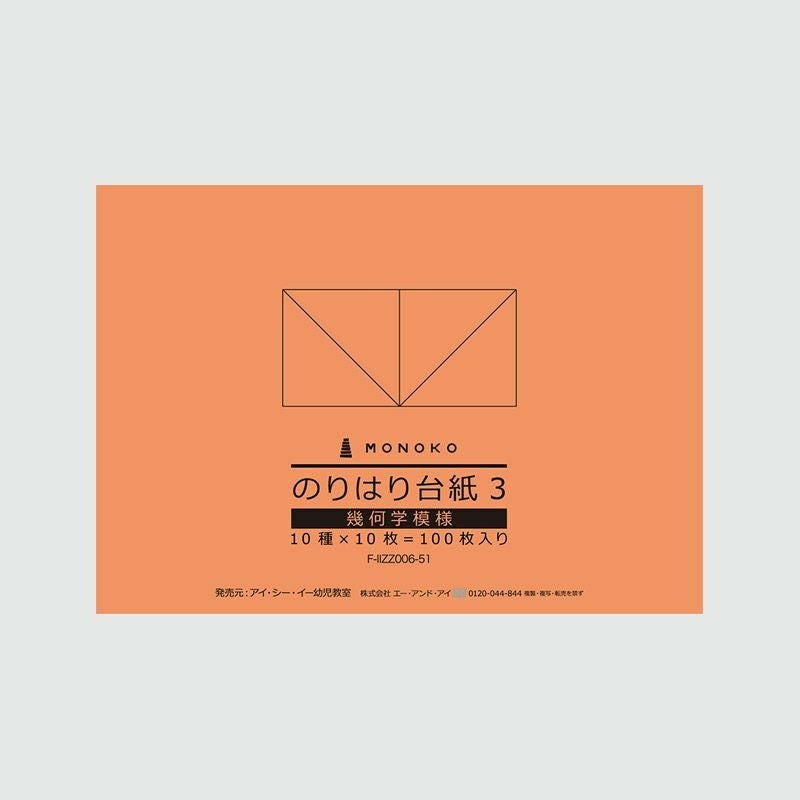 正方形の一辺が35mmを基準に「円」「三角」「四角」「二等辺三角」「半円」の5種のピースで構成されています。のりはり台紙3は一枚に2~6つまでの色紙を幾何学模様に貼ります。