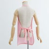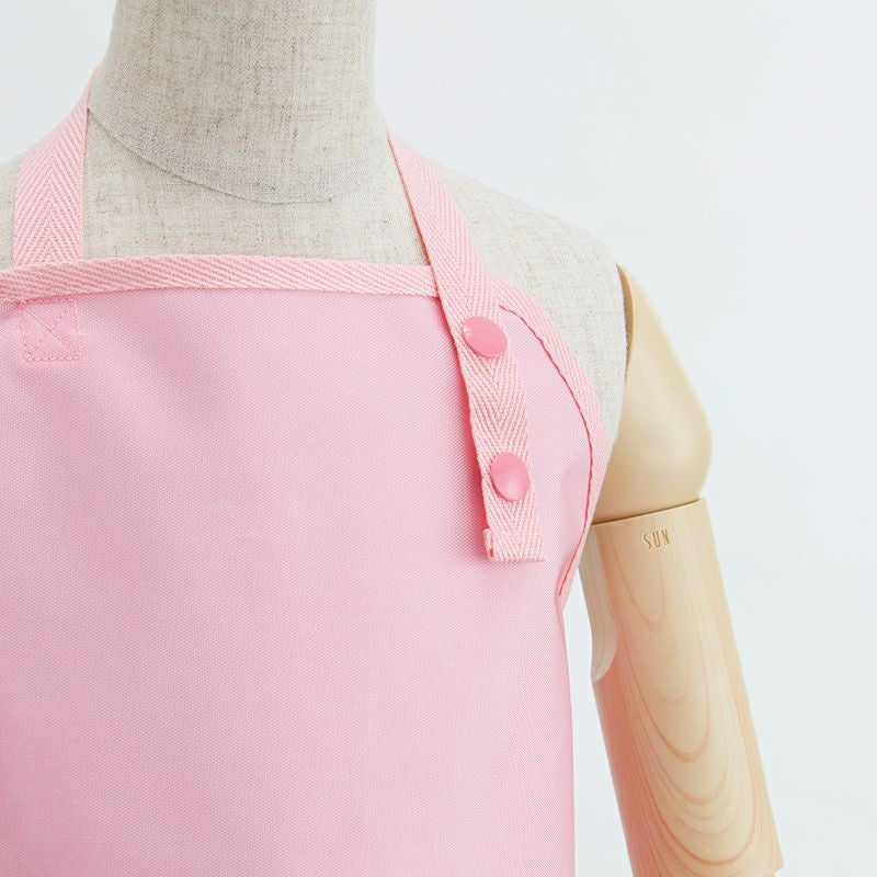 首は手前でホック留めができます。腰ひもは後ろ手でひも結びをする形です。お手伝いしたい気持ちをサポートするエプロンです。