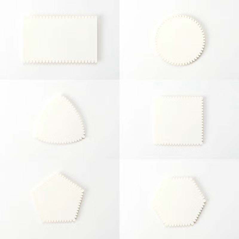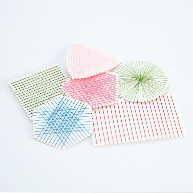 こどもは自分の手が思い通りに動かせることによって自信をはぐくみます。「糸を巻くお仕事」としてはじめてのお子さまも完成できるよう、波の大きさははじめて糸巻きをされるお子さま向けと慣れてきたお子さま向けに2種類用意いたしました。適度な張りがある厚さとお子さまに持ちやすいサイズで、掛けた糸の作り出す模様がきれいに見えるよう表も裏も白くなっています。食品の容器に使われる特殊な紙を使用し、角は丸く仕上げ、こどもへの安全性についての配慮もされています。