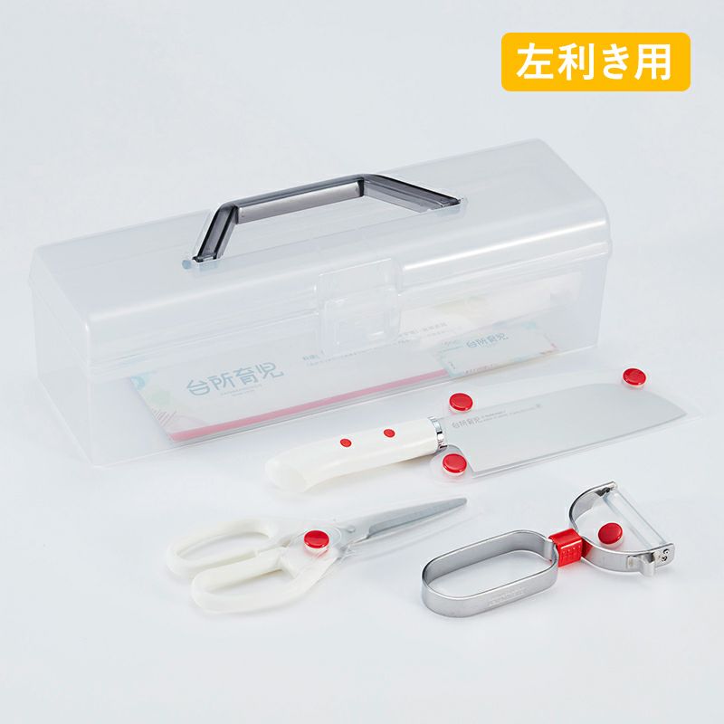 野菜の皮をむく、材料を混ぜる、小麦粉をこねる、食器を洗うなどの活動を経て、十分に指・手・手首が動かせるようになったらぜひご用意いただきたいセット。 子どもが使いやすいように設計された切れ味のいい本格包丁と、持ちやすいハンドルのハサミとピーラーのセットで、はじめてのクッキングをサポートします。家庭でも実践しやすい、イラスト入りの取扱説明書付きです。