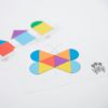 正方形の一辺が35mmを基準に「円」「三角」「四角」「二等辺三角」「半円」の5種のピースで構成されています。のりはり台紙4は一枚に6~11までの色紙を具体物のモチーフに貼ります。