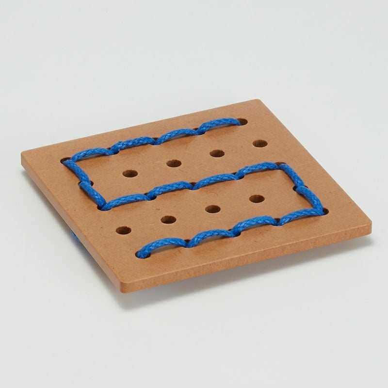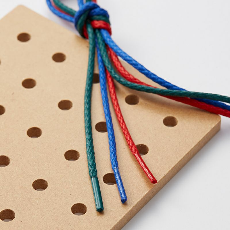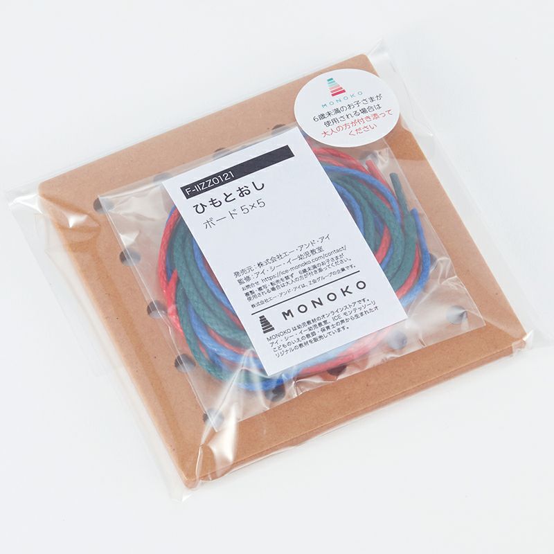 ちいさな手にも扱いやすいサイズです。木製(MDF)なので適度な重さがあり、ひも結びの練習にもお使いいただけます。専門メーカーに製造をお願いしたすべて国内生産のMONOKOオリジナル商品です。解答に集中できるよう、ひもの「通しやすさ」や「ほどきやすさ」などは特に考慮しました。