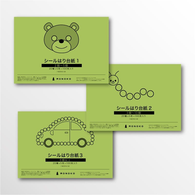 台紙3:「丸シール(大)」「丸シール(中)」「丸シール(小)」(別売り)を使用するシールはり専用の台紙です。はる数は1枚に6片以上。「丸の大小を区別する」「ドットをつないで線を表現する」ことができます。