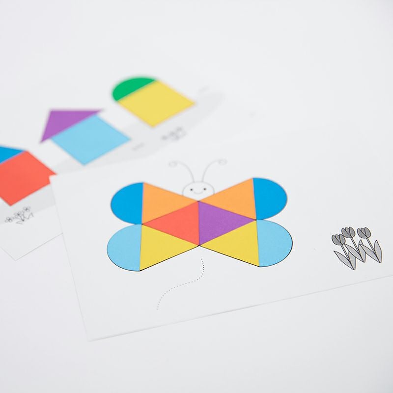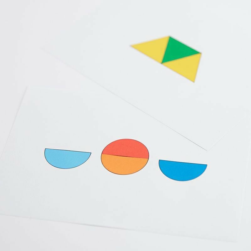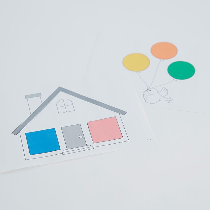 台紙1形の認識:一枚に1~3つまでの色紙を貼ります。よく使う「円」「三角」「四角」の台紙はそれぞれ20枚入っています。