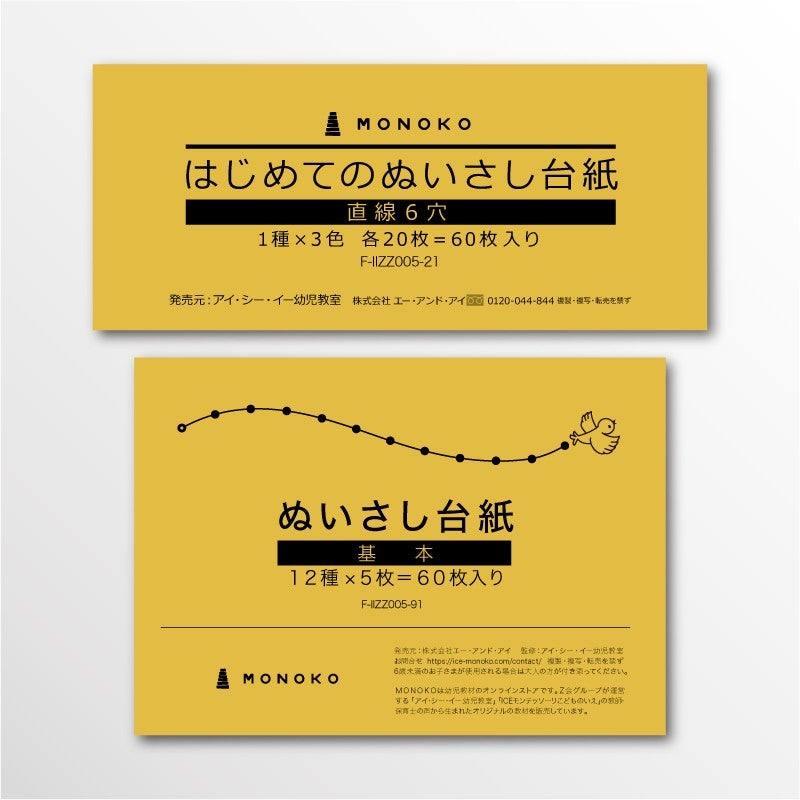 はじめてのぬいさし台紙より大きく、その後のぬいさし台紙シリーズよりも一回り小さな台紙です。はじめてモチーフをぬうお子さまが完成させられるよう点の数も少なめです。1冊の中で直線から波線、円と難易度が上がります。表と裏をしっかり確認しながらぬいあげられます。