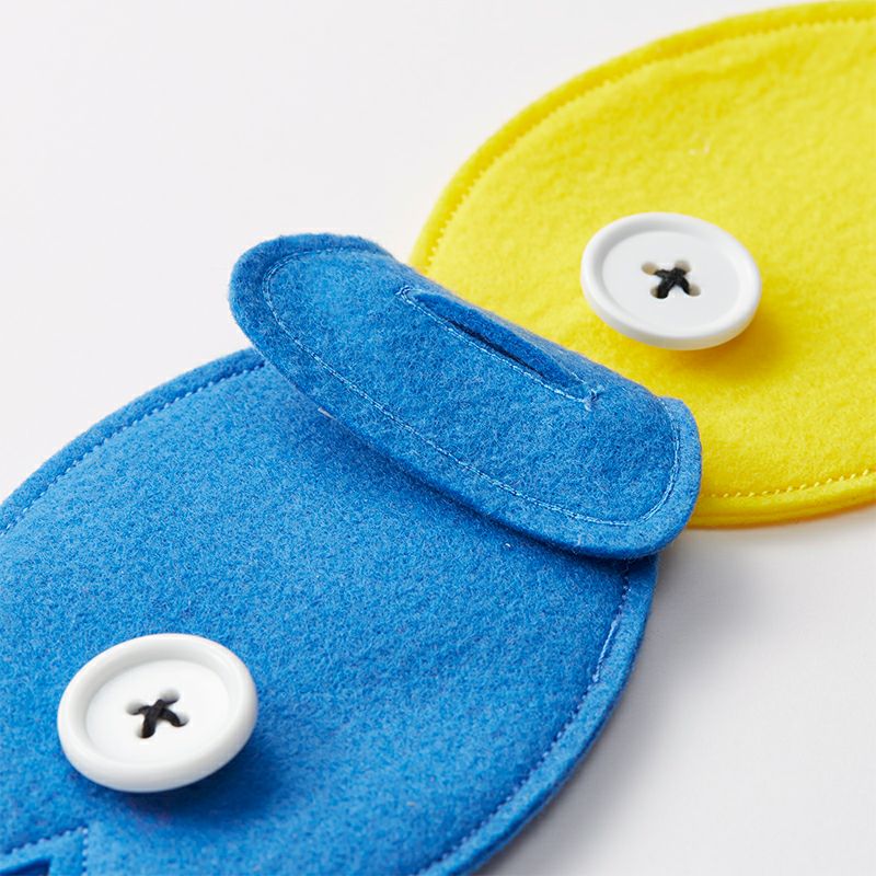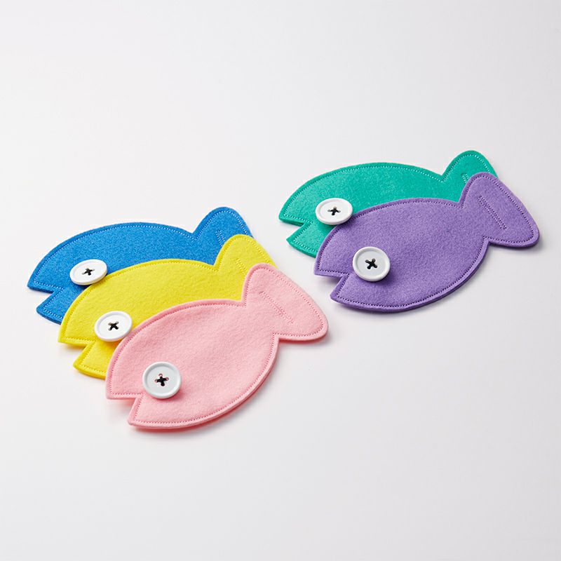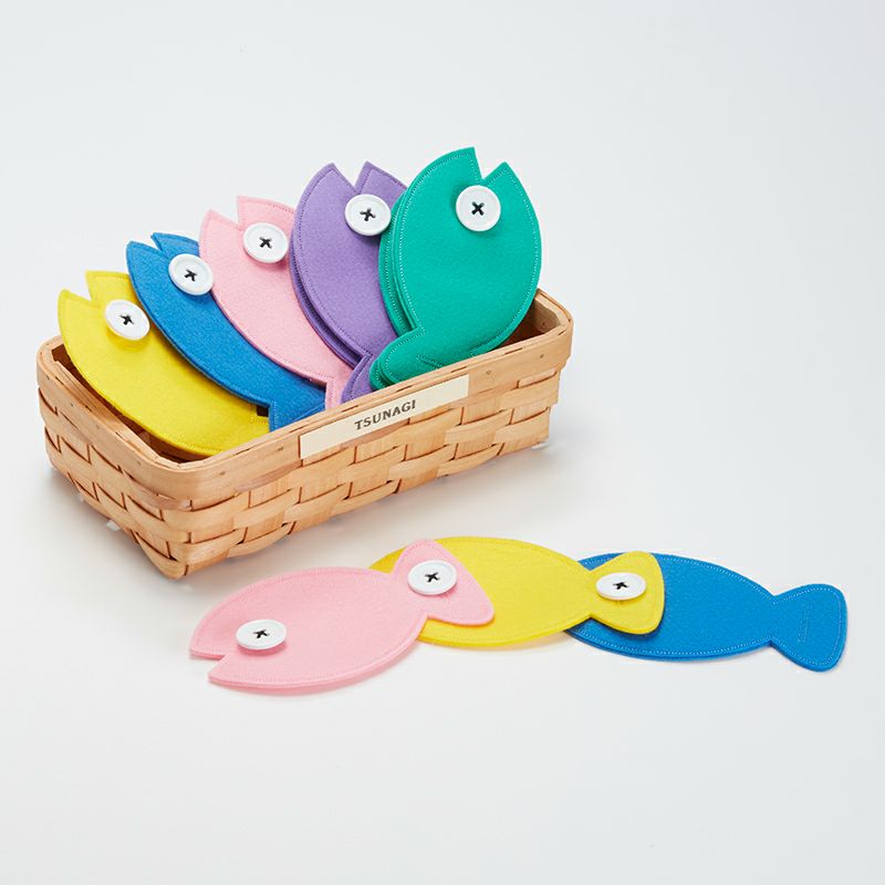 さかなのモチーフをボタンでつないで遊びます。5色あるので、違う色を交互につないで遊べます。保育の現場で教師が手作りしていた教材を、お子さまが思わず手に取りたくなるようかわいいデザインにして商品化しました。日本製。