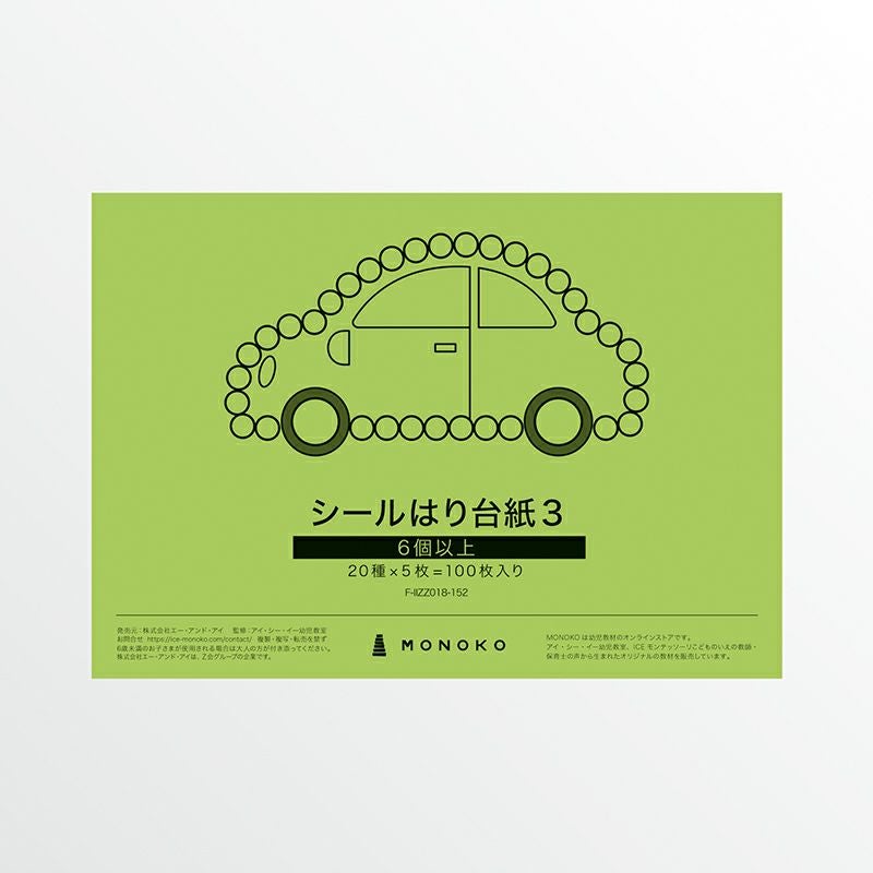 「丸シール(大)」「丸シール(中)」「丸シール(小)」(別売り)を使用するシールはり専用の台紙です。はる数は1枚に6片以上。「丸の大小を区別する」「ドットをつないで線を表現する」ことができます。