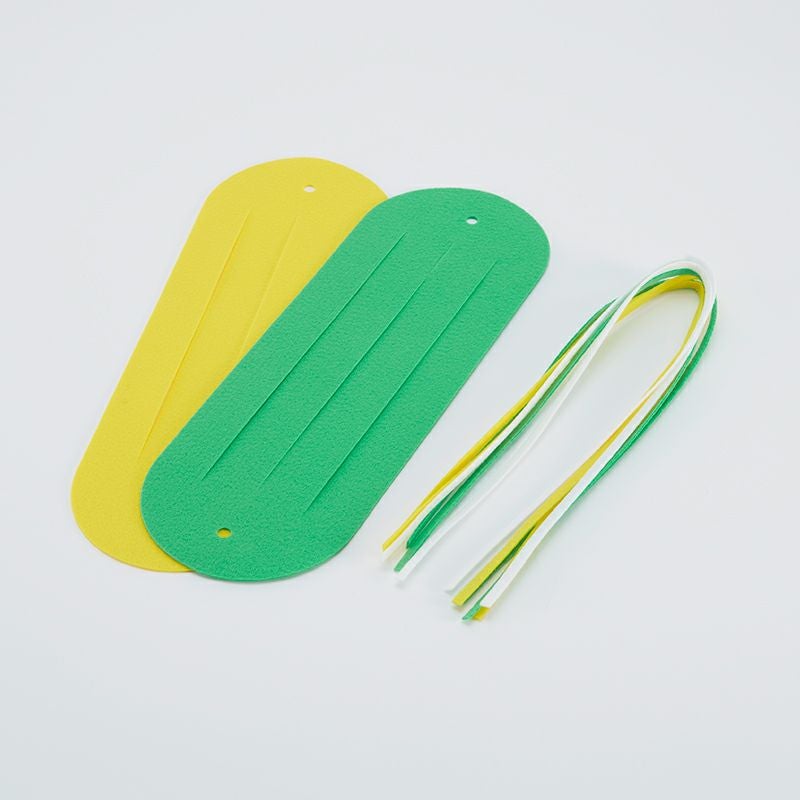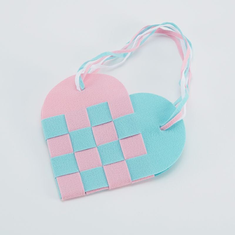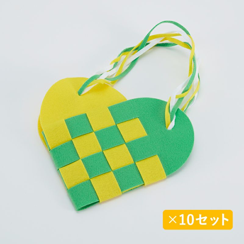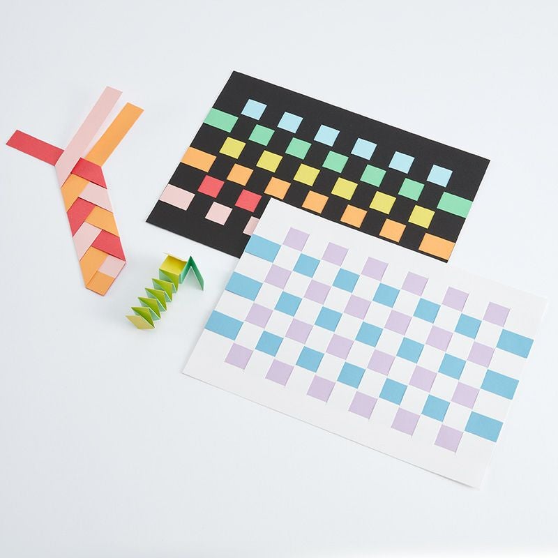 「紙織り」はスリットの入った台紙に、紙帯を交互に通していく活動です。より複雑な「ハートバック」制作の前段階の教材としておすすめです。