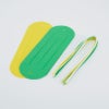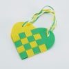 2枚のカット済みのフェルトを二つに折り、輪になった切り込み部分を交互に通します。はじめてのお子さまも無理なく完成できる本数で構成しています。張りのあるフェルトを使用していますので、スムーズに織ることができます。紙より滑りにくいのでしっかり指先を使って動かす必要がありますが、まだ指先をうまくコントロールできないお子さまでも破くことなく活動できます。バッグの持ち手は、細くカットされたフェルト帯を三つ編みして作ります。この教材ひとつで、いくつもの活動をすることができます。