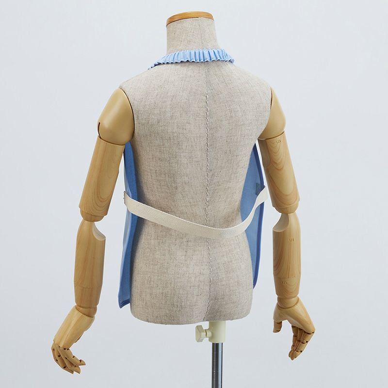 首ひもはゴムが入っています。腕が上手に後ろに回るようになったら、前にあるマジックテープを自分で留めることができます。腰ひもも同様に自分で留められます。自分でできる喜びを感じられるエプロンです。