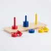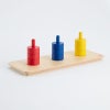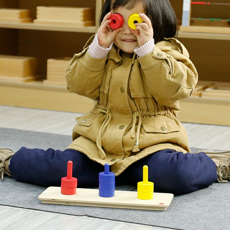 リングさしができるようになったら、次のステップとして色の三原色に色分けされたこちらの教具がおすすめです。3本垂直の棒に赤、黄、青の3色で構成されたディスクを差し込みます。3色の色の違いを認識しながら、ディスクをつかむ力や、穴へ確実に通す正確性、集中力を養うことができます。