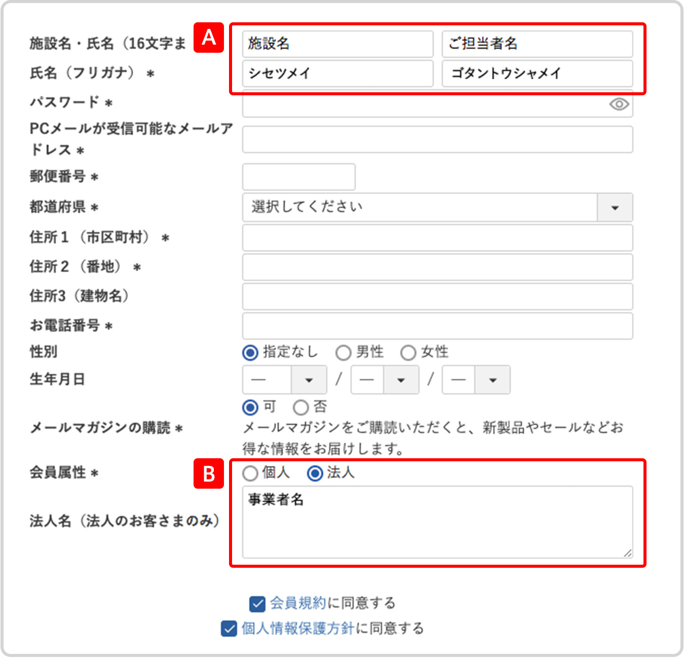 「氏名」に(左)施設名 (右)ご担当者名を入力